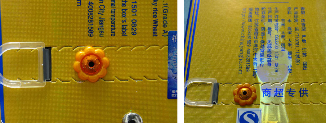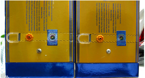 ⑤如下图所示,左边为真,右边为假,真酒有生产日期和批号,假酒则没有。