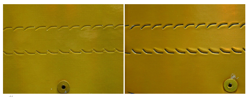 ④如下图所示,左边为真,右边为假,仔细观察机器切口,真酒浅,缝隙小。假酒机器开口深,缝隙大。