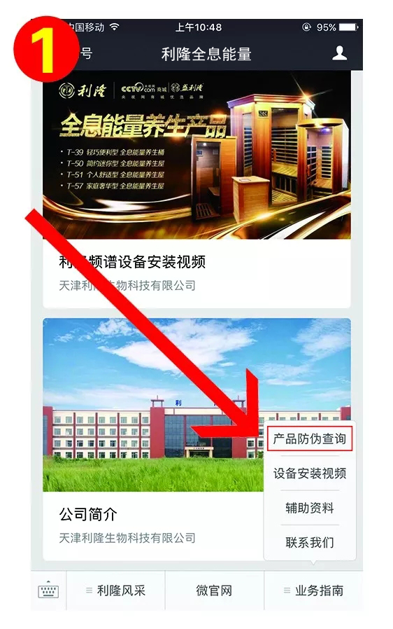 第一步:打开本公众号,点击右下角“业务指南”——“产品防伪查询”