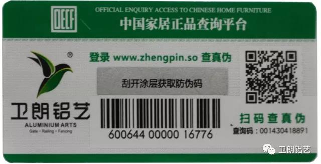 卫朗铝艺产品实行“一品一码”,每一件产品都有一个不同的条码,通过"、家居正品查询平台"让消费者随时识别,防止买到假冒伪劣产品,切实保护消费者的合法权益。