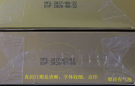 正品的生产日期是点印的,字体比较细,也更清楚一些,塑封比较粗糙有起泡,饭馆假货的字体比较粗,包装比较细致。
