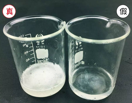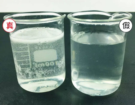 在精华液中倒水,真货杯中的状态没有多大变化,依然是又浓稠又有气泡,而假货简直跟一杯水没多大区别了。