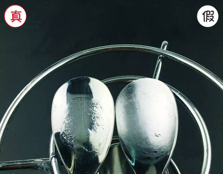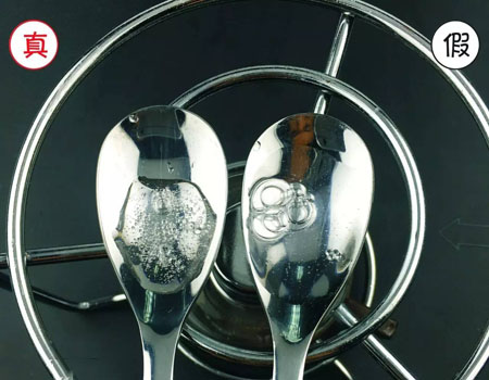 用勺子取少量精华液在酒精灯上加热,加热之前真货的精华液浓稠,而假货的精华液很稀。