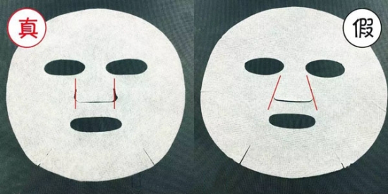 展开面膜纸,真货鼻子两侧的剪裁近乎垂直,整个面膜纸形状偏方形,而假货的剪裁是斜着的,面膜纸形状偏圆。