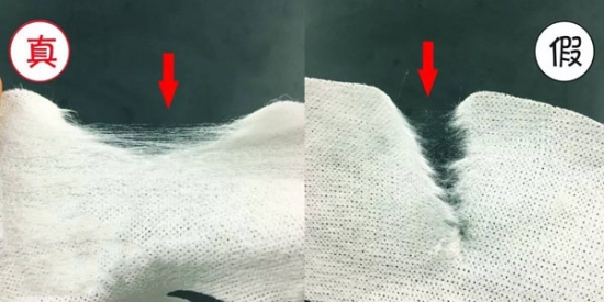 将面膜纸撕开,真货里面的蚕丝很难完全被扯断,而假货内层材质不过关,很容易扯断。