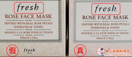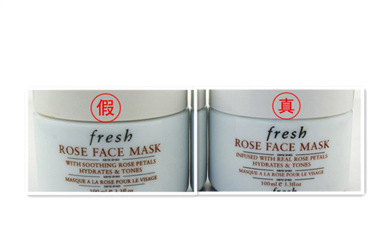 馥蕾诗玫瑰面膜从外包装分辨真假的话,重点是放在它们的包装盒文字、字体上,正品的玫瑰面膜会在Fresh的logo后面有一个R的商标,标志比较小,容易被忽略,所以很多仿货没有这个细节。
