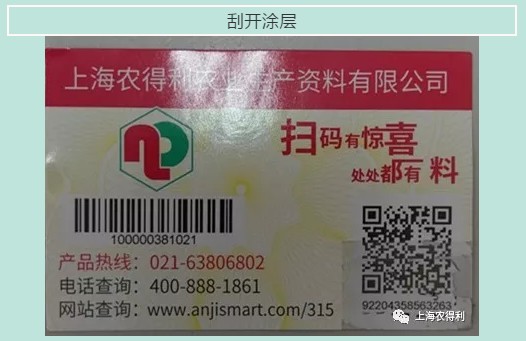A、进入“农得利”微信服务号或订阅号,选“防伪查询”菜单,刮开涂层,输入防伪码与验证码进行查询。
