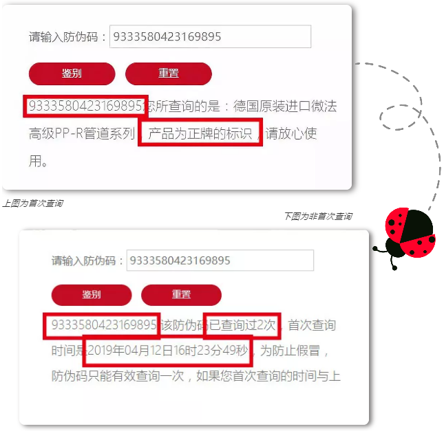 若您购买的微法管产品,防伪码查询结果为,验证非首次页面则会提醒,该产品序列号、查询过的次数、及首次查询时间。