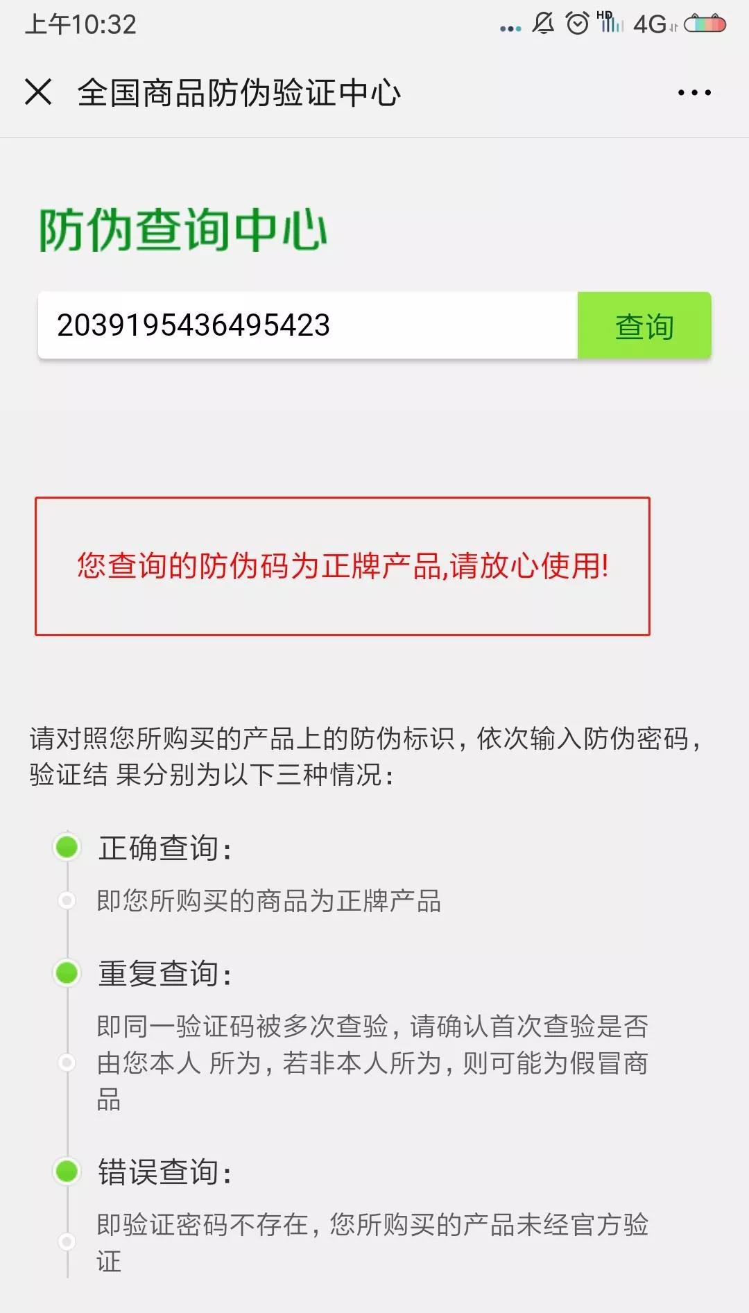 温馨提示:您可通过以上方式查询所购买产品的真伪,每个防伪二维码只能正确查询一次,请消费者注意看清查询结果。