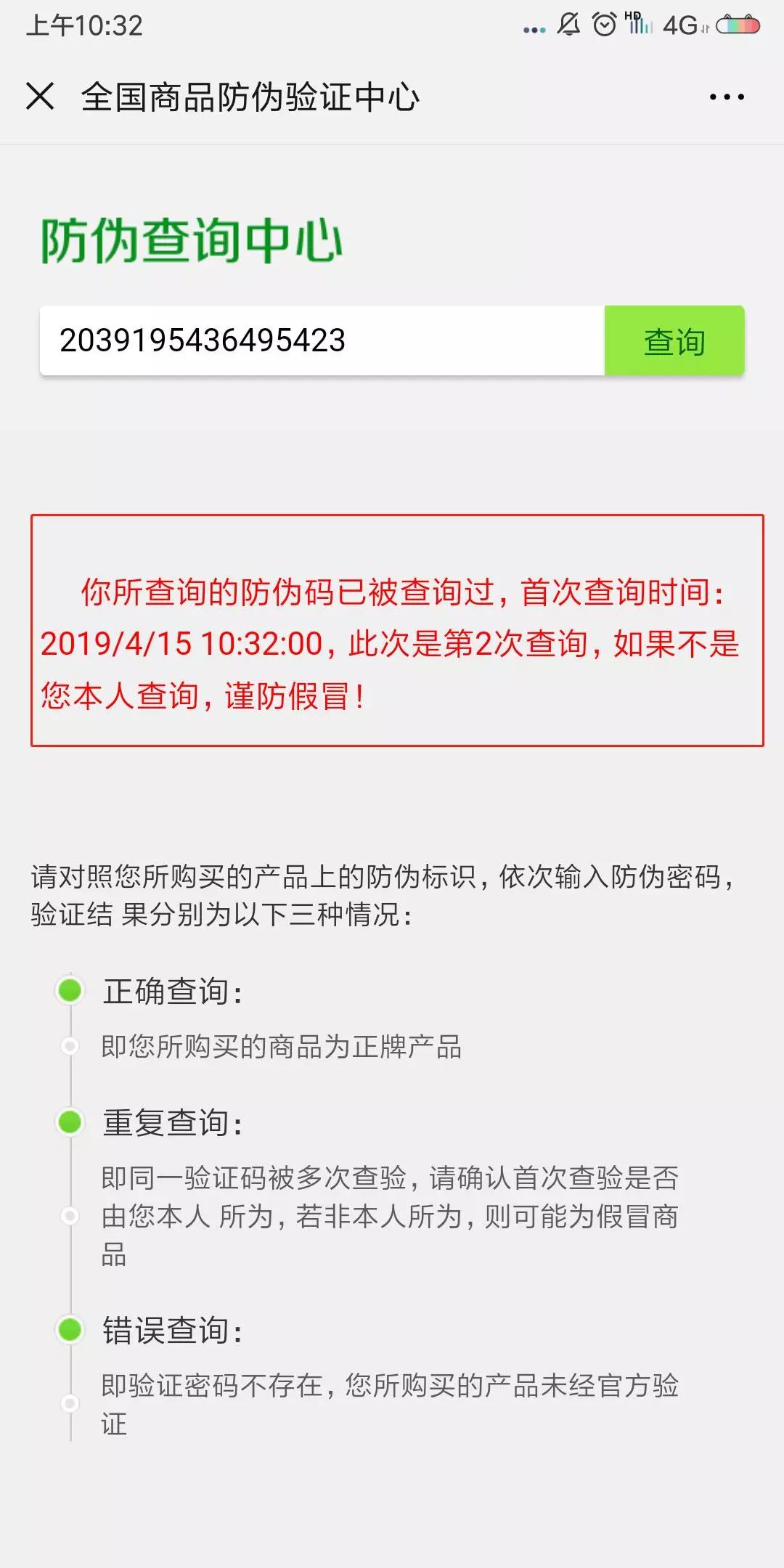 6、注意:防伪码具有唯一、,只能扫一次。如果这个防伪码 已经被查询过 ,会显示第一次查询时的详细时间等信息,这时候就要擦亮眼睛确认是不是自己首次查询时的时间。如果不是自己的首次查询时间,视为假冒。