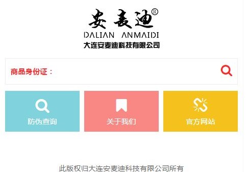 选择“大连安达”,进入“安达”品牌的防伪查询。(如下图)在“商品身份证”中输入即可。