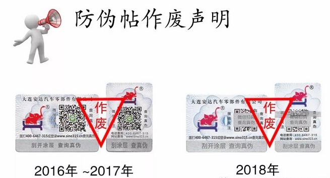 2019年以前的防伪码,自2019年开始不会再继续使用,市场上现存配件上旧防伪码依旧可以通过微信公众号上“2018旧防伪”或防伪上的电话和网站,进入防伪查询。现存旧防伪码将会陆续替换。同时择日关闭旧防伪码验证通道。
