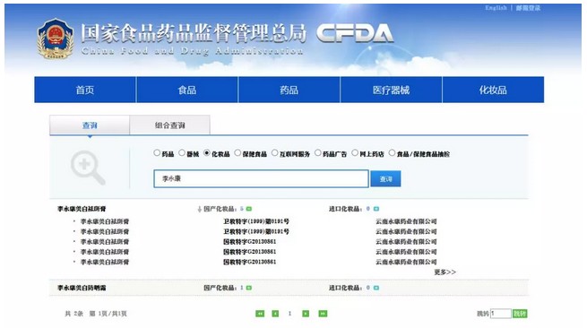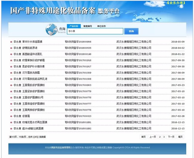 百度搜索进入“国产非特殊用途化妆品备案”服务平台,在搜索框输入品牌名称李永康,即可查询到李永康旗下多达45种美容护肤产品。让每一个用户都能完美绕过“三无”产品。