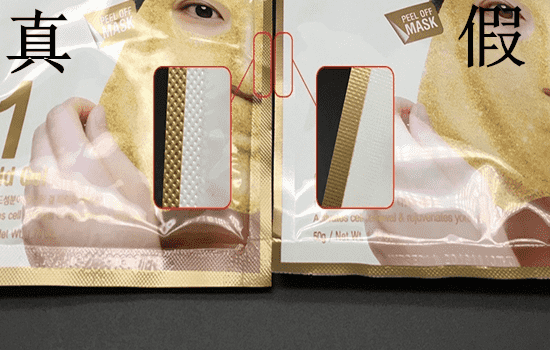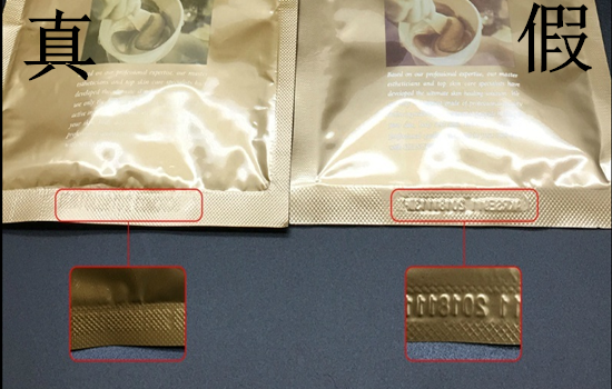 反面包装印刷:真品的香蒲丽黄金面膜反面包裝的压花十分的深,而仿货的香蒲丽黄金面膜反面包裝的压花则十分浅。