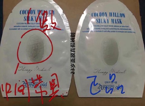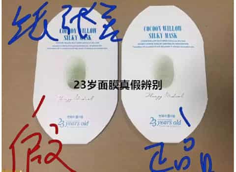从外包装盒鉴别23岁面膜真伪,比照外包装盒能够看得出真品包装印刷清楚,色调匀称,而仿货包装印刷一些模糊不清,正中间桑蚕丝黑影模糊不清,纸型较弱。