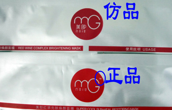 R标反面商标logo标志有R标(2013年美即的注册商标取得成功,之前的TM所有改成R标):真品上带英语“RG”的右上方常有R标志,没有英文只能汉语“美即”的则在“即”字的右下方有R标志,仿货沒有。