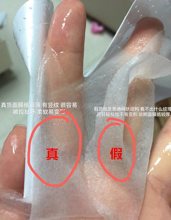 蒂佳婷药丸面膜真假之看面膜纸,真品面膜纸太薄,有显著的竖纹,非常容易被牵扯坏,绵软易形变,而仿货面膜纸过厚,是一般多孔结构,看不出来哪些纹路,且不容易牵扯形变。