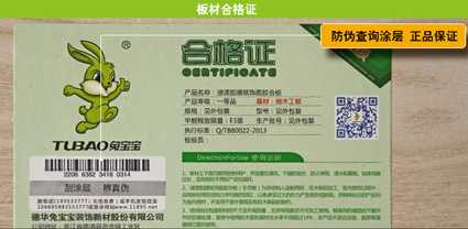 4、二维码查询:兔宝宝板材防伪新的标识上有二维码功能,用手机扫描产品合格证上的二维码信息,可查询产品真伪。