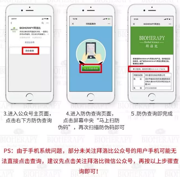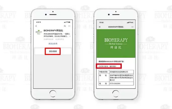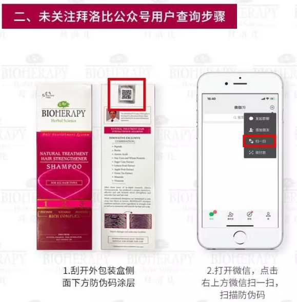 为保护消费者权益及安全,维护品牌正当知识产杈,即日起,BIOHERAPY拜洛比微信防伪识别系统正式上市使用,、大陆地区所售BIOHERAPY拜洛比产品防伪标志陆续启用(批次在2024年11月及以后的产品均贴有防伪标志)。请大家购买到贴有防伪标志的BIOHERAPY拜洛比产品时,通过防伪识别系统扫码确认真伪,扫码方式和瓶身标识如下图所示。