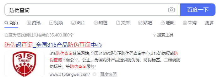 首先消费者购买到产品后,百度搜索防伪查询点击、315产品防伪查询中心,进入网站。