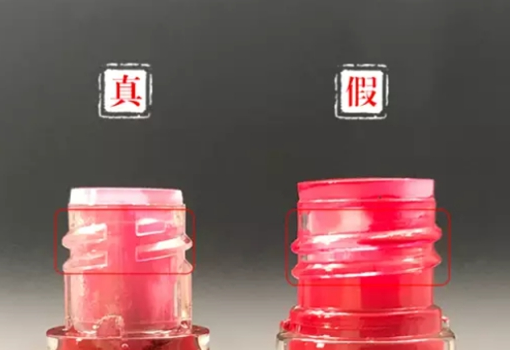真假两根唇釉的瓶口部位的螺纹有明显区别,正品螺纹有断裂处,假货全圈螺纹。