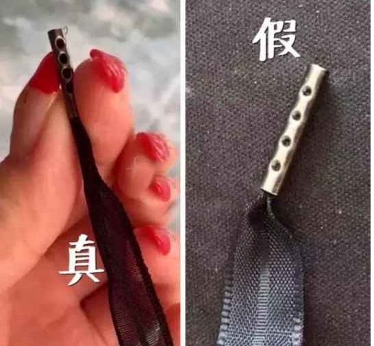 二是注意丝带的金属头,对比可以看出,正品的孔要大,间距小,整体偏向一侧。假货孔较小且分布均匀。