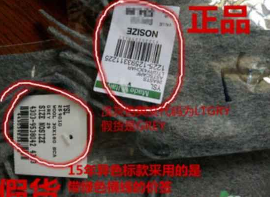 正品的YSL圣罗兰围巾的价签底部会有一条绿色的横线,这也是正品的异色新款围巾,而假货还采用的是以前的同色标款围巾的编码,字样也不够专业。
