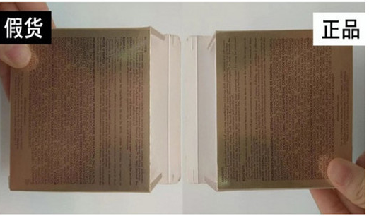 看外包装,这里他一边有一个按压纹,正品的这个按压纹属于比较清晰,而且两边都一样长的这种,假货这个呢,他的按压纹路就比较浅一些,而且有点短,右边的这个按压纹还出现了一点问题。