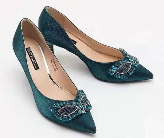 ④饰扣:真的星期六女鞋假如有装饰链的话是是偏金色的,假如有水钻的话水钻带有光泽,显得高贵,假货星期六女鞋的饰链是偏铜色,没有光泽。