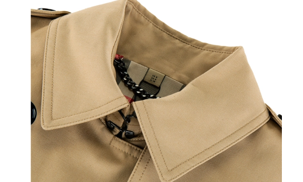 首先Burberry风衣的内衬来看,它的经典红线是必不可少的,并且也是其他线条不能取代的。其次就是风衣的领布,正品的Burberry风衣的格子领部是对称的,即便是反过来都是对称的,而一些、品为了降低成本,节省布料,格子上的线条都是随机的。