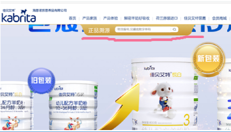 除了微信公众号外,也可以通过佳贝艾特网站进行真伪查询。首先百度佳贝艾特网站,然后点击登录该网,在首页中间处就可以看到溯源的查询框: