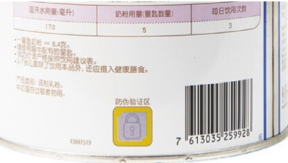1、找出奶粉罐身上的锁状防伪标志区,这个通常位于奶粉罐的背面下方近条形码的位置。
