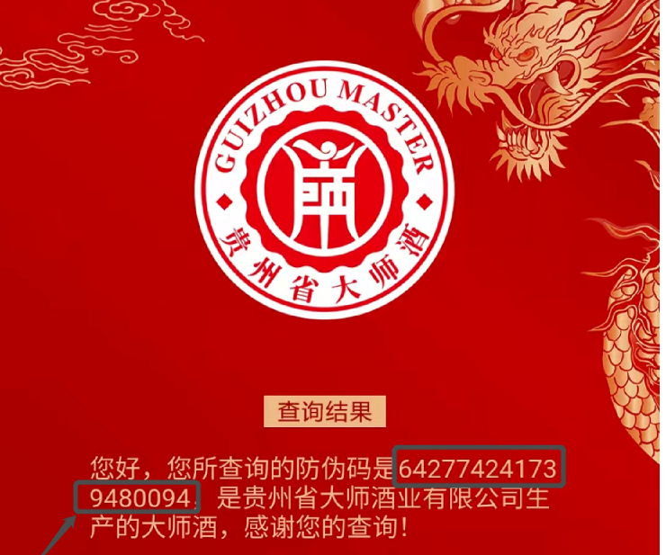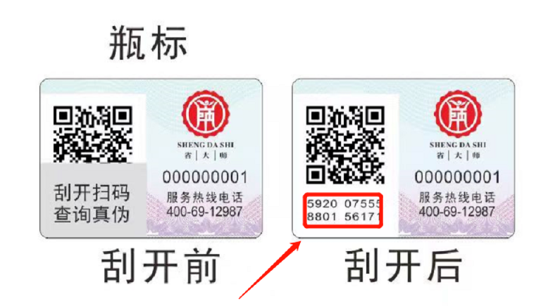 一瓶一码:消费者可通过产品与盒子的防伪码,刮开图层识别防伪二维码,仔细查看查询结果,查看防伪码与图层覆盖的防伪数字码是否一致。