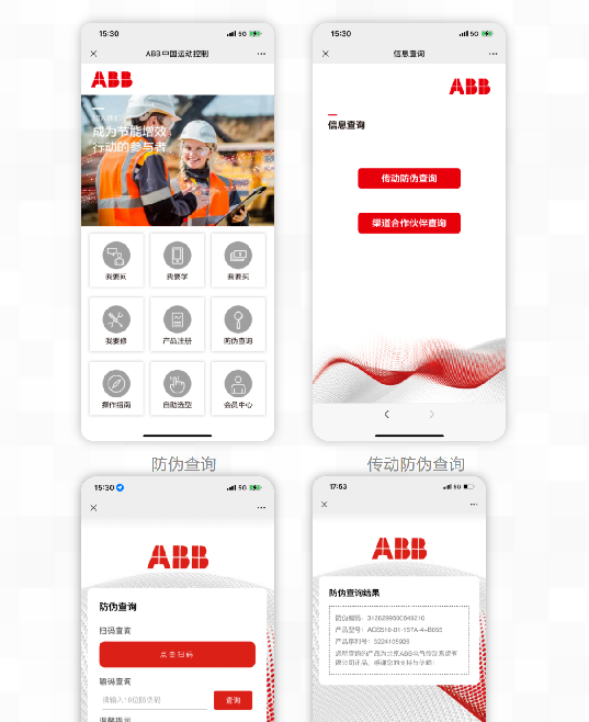 扫描防伪标识表层二维码➡关注“ABB传动”微信公众号➡支持中心➡防伪查询➡传动防伪查询➡揭开防伪标识表层,扫描或输入底层防伪码➡查看防伪查询结果图片图片
