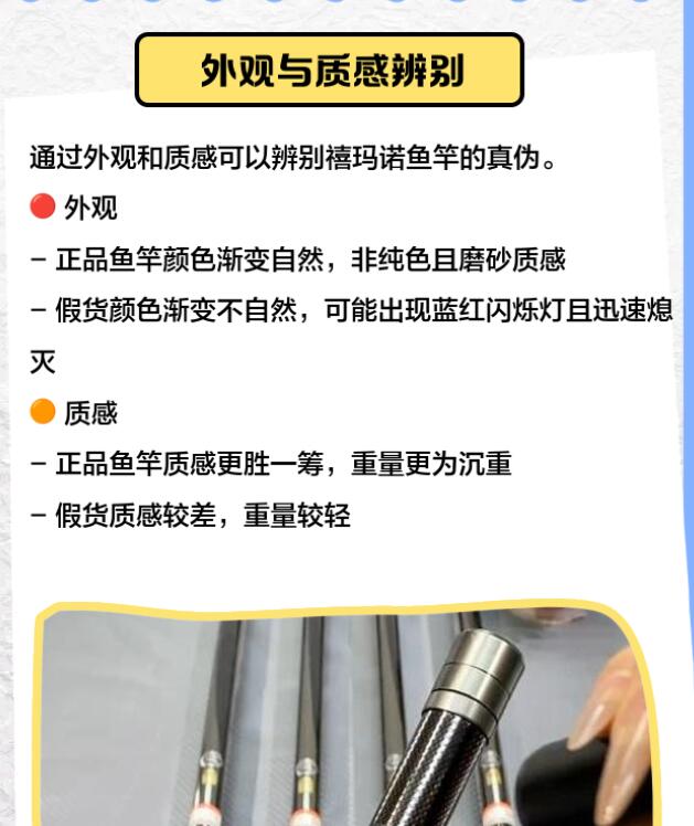 ‌3、试用体验‌:如果条件允许,您可以通过试用鱼竿来感受其能和品质。正品鱼竿通常具有良好的手感和使用体验,而假冒产品则可能在重量、弹、灵敏度等方面存在明显差异。