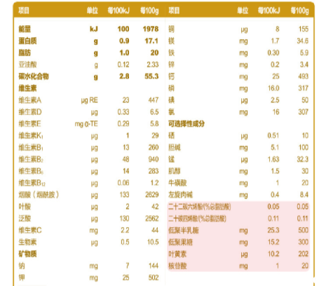 下面具体来说说君乐宝乐畅奶粉的营养配方,除了基础营养配方外,君乐宝还有一系列的强化配方,特别添加胆碱、肌醇、左旋肉碱、叶黄素等营养元素,给宝宝全面营养呵护,这里要注意看其特色强化配方和常规强化配方(可选择、成分):